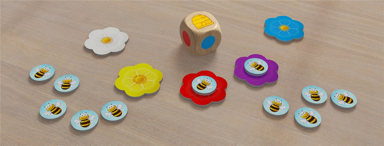 En este juego debemos lograr que todas nuestras abejas sean las primeras en volar hasta la colmena (el cubilete) o hasta las flores. Para ello, por turnos se lanza el dado de colores y en función del color resultante podremos desplazar una de nuestras abejas o deberemos dejarlas donde están.