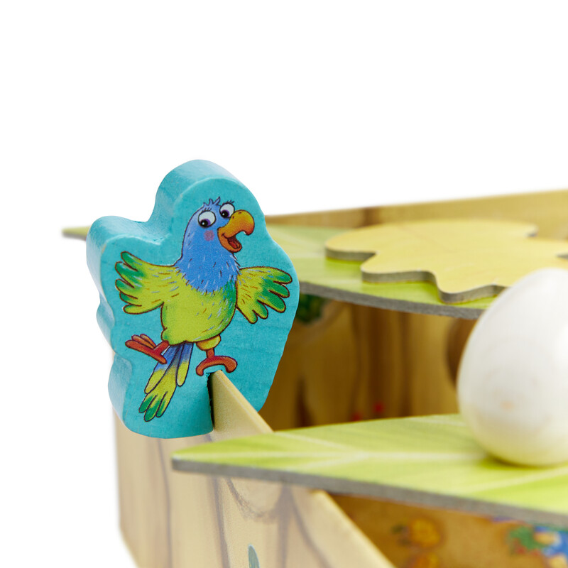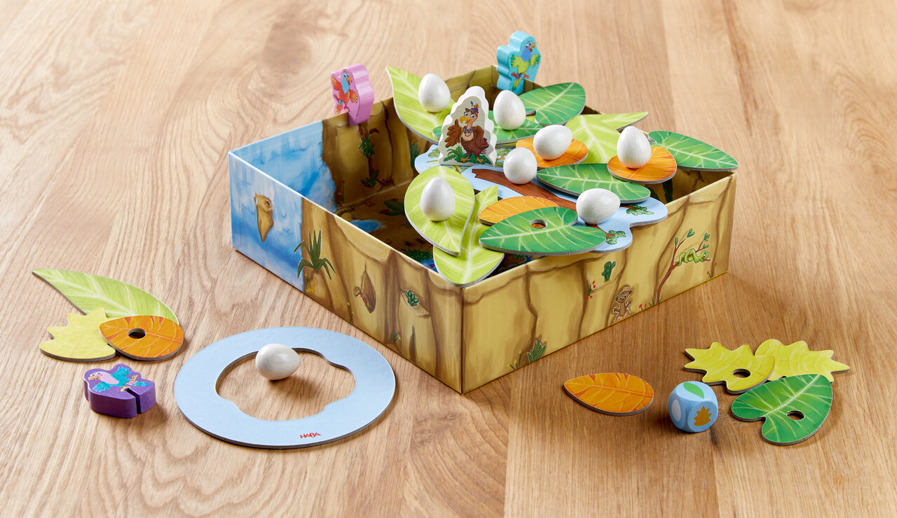 Doña Buitre está a punto de poner huevos y debemos ayudarla a construir un nido seguro para ponerlos todos a salvo y que no caigan al arroyo. Por turnos iremos colocando hojas o huevos entre el tronco y los bordes de la caja con el objetivo de que no se caiga nada. Un bonito y emocionante juego de destreza con una ambientación única.
